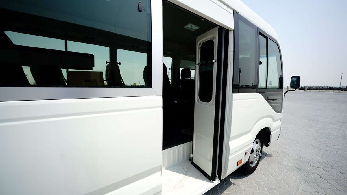 The Toyota Coaster bus is a dependable and spacious option for group transportation, accommodating up to 30 passengers comfortably. It is ideal for school trips, corporate events, tourism, or large family gatherings. Designed with a focus on passenger comfort, the Coaster features reclining seats, ample legroom, air conditioning, and large windows for a pleasant travel experience. Known for its robust build and reliable performance, it handles urban and highway driving with ease. Safety features like seat belts, anti-lock braking systems (ABS), and stability control ensure a secure journey. Renting a Toyota Coaster offers cost-effective, comfortable, and reliable transport for larger groups.